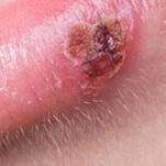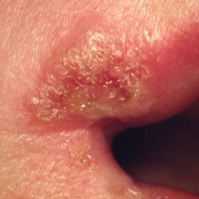 Ulcer – Eventually the pustules burst and join together to form one large, shallow, weeping cold sore that is very painful.