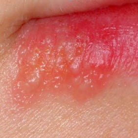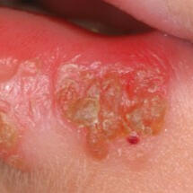 Ulcer – Eventually the pustules burst and join together to form one large, shallow, weeping cold sore that is very painful.